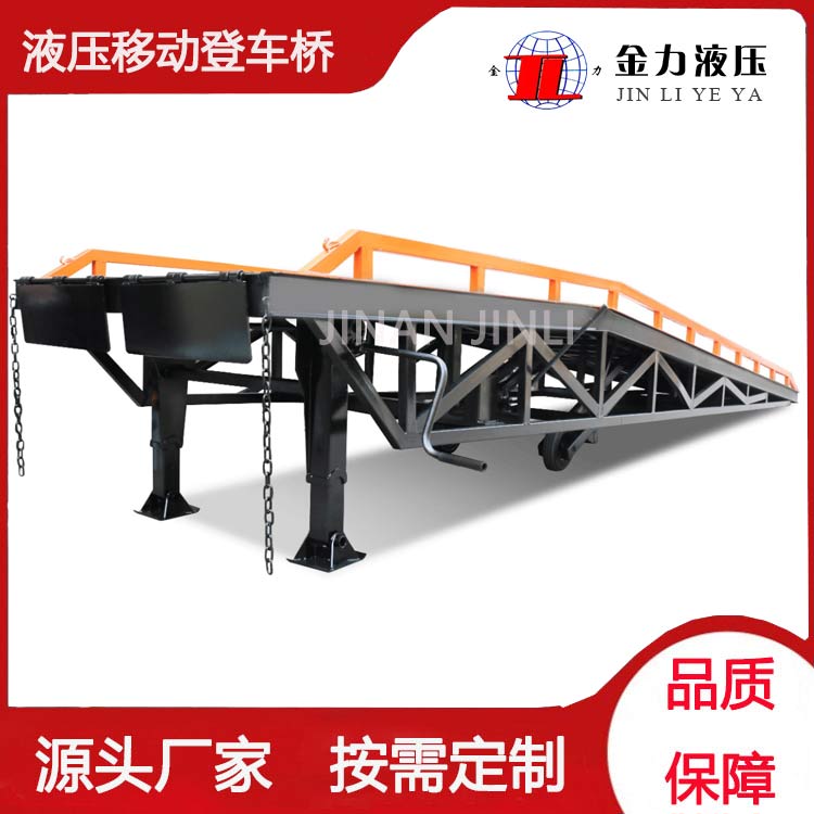 移动登车桥是与叉车配合使用的货物装卸辅助设备,可根据货车车厢不同高度调节,实现货物的快速装卸。